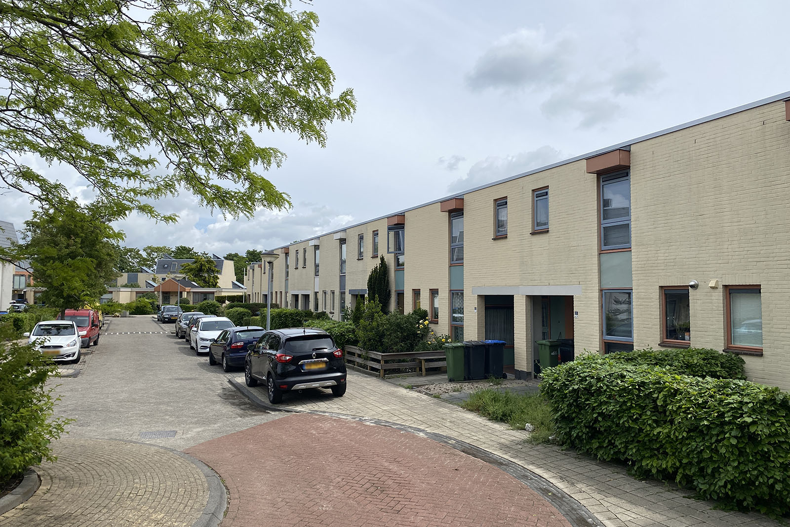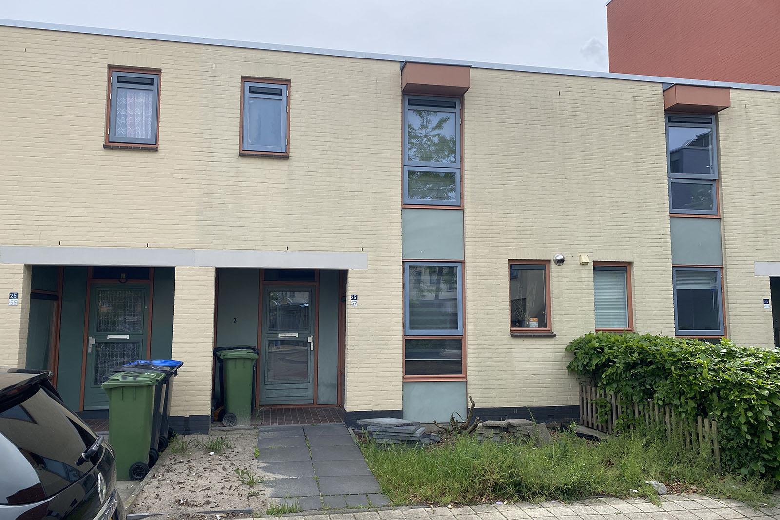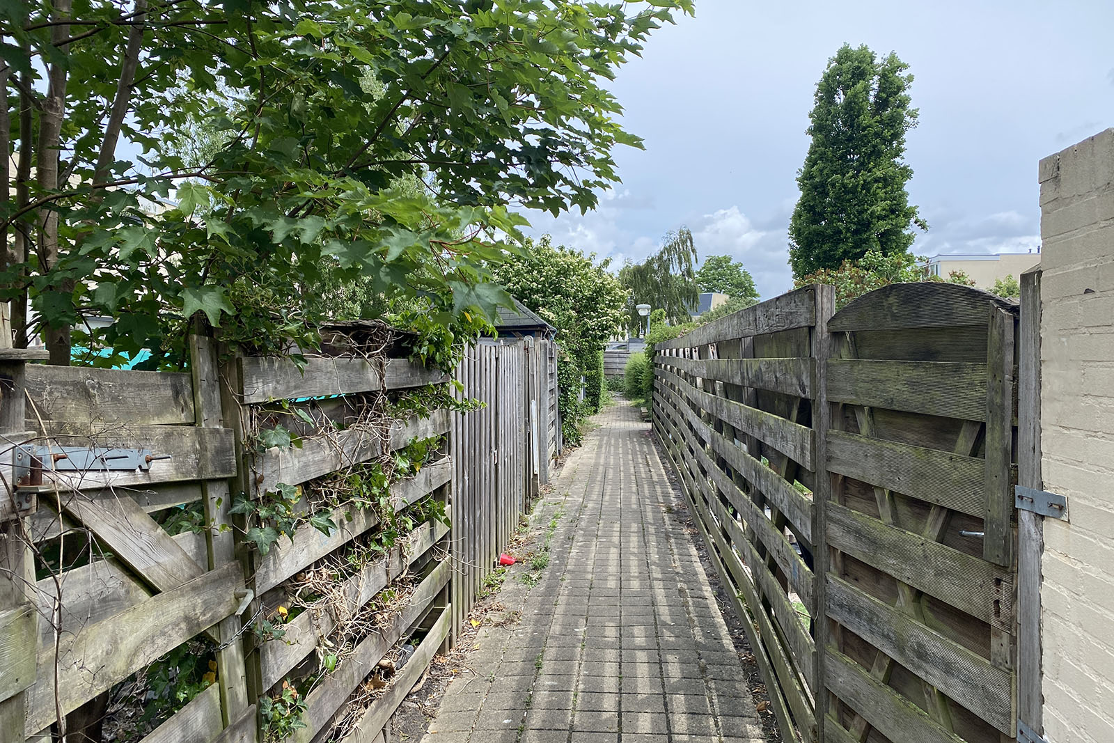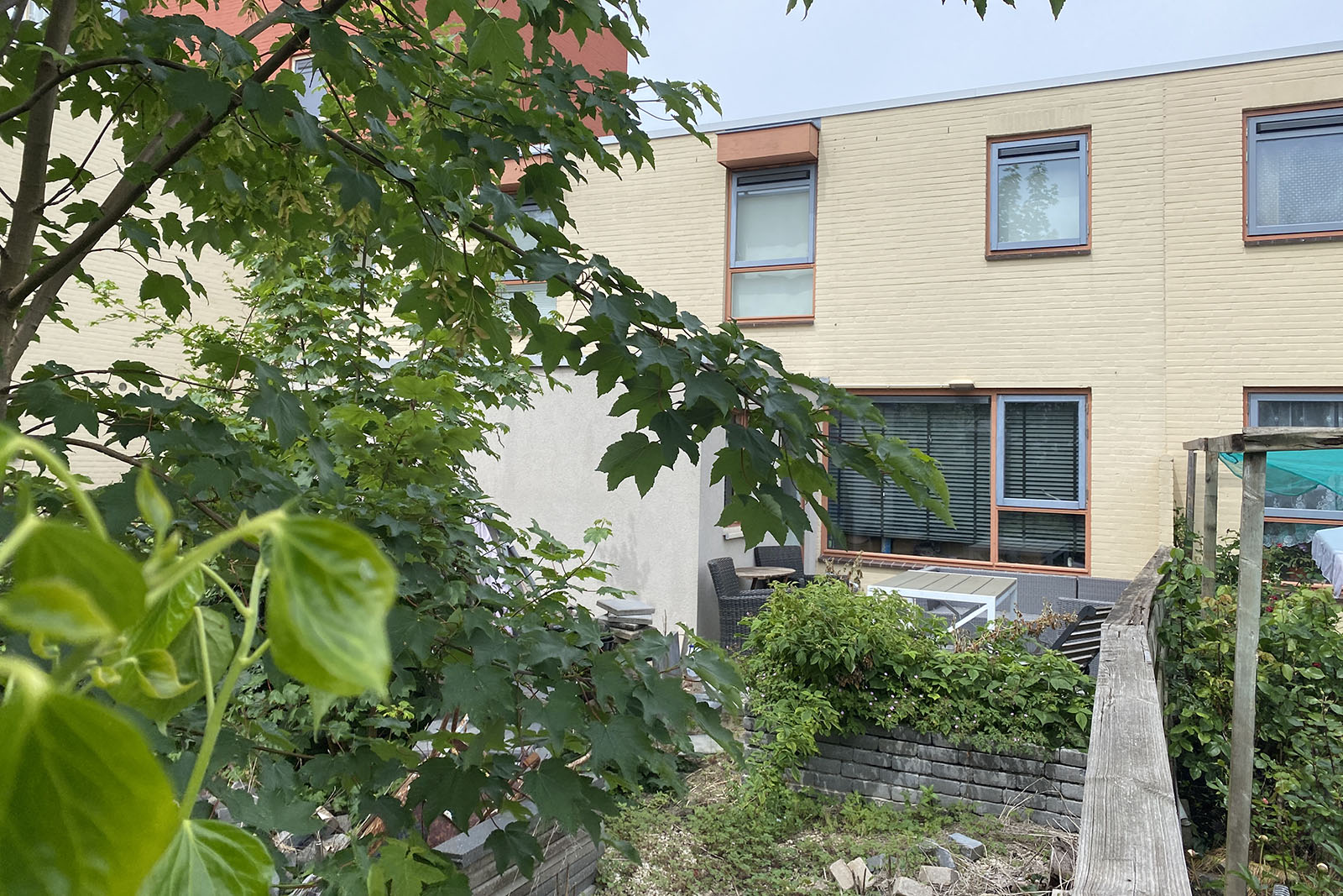 Tussenwoning met aangebouwde stenen berging/bijkeuken en een voor- en achtertuin.
