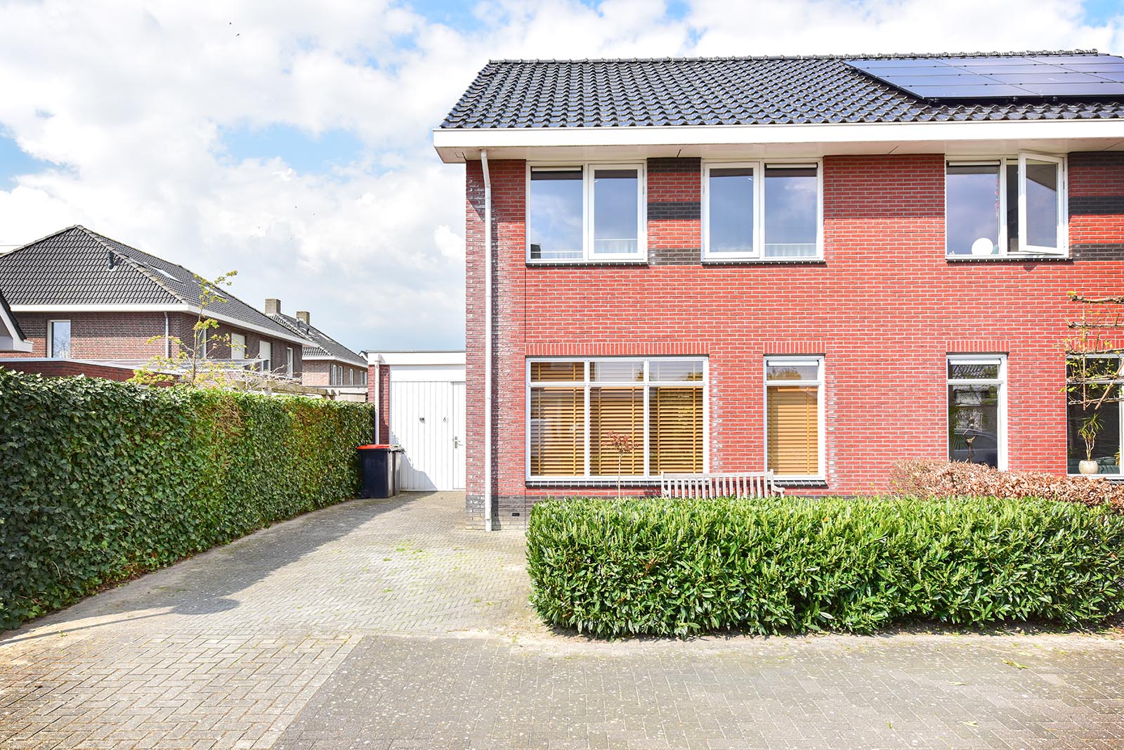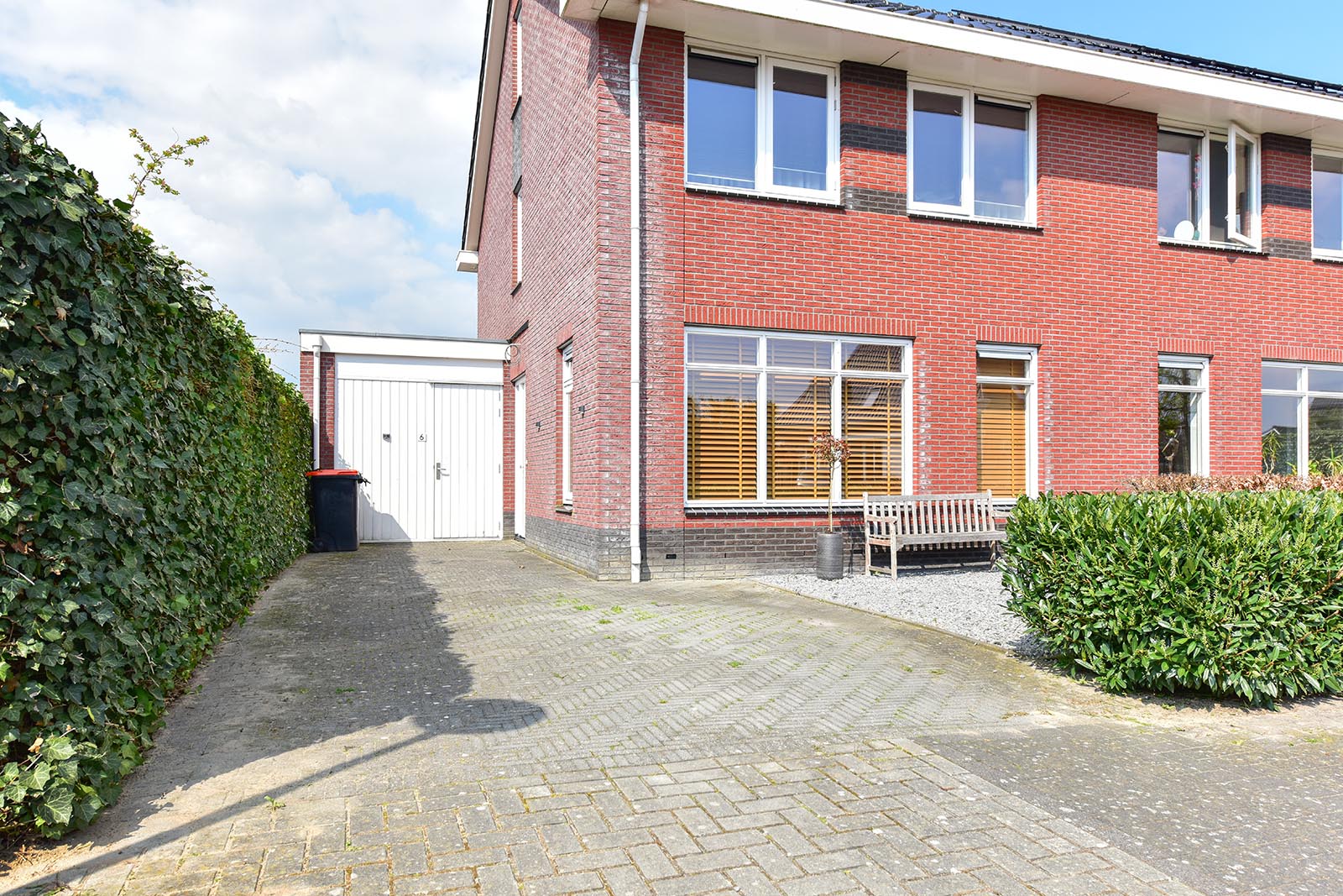 Extern: standaard aangelegde tuin (voortuin/achtertuin). De hoofdtuin is gelegen op het noordwesten. Aangebouwde stenen garage.
