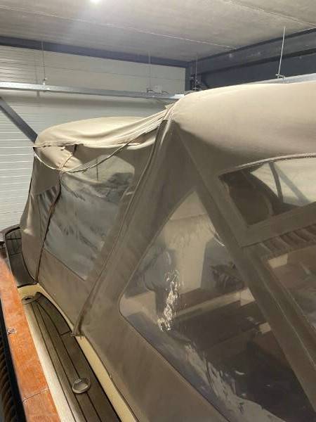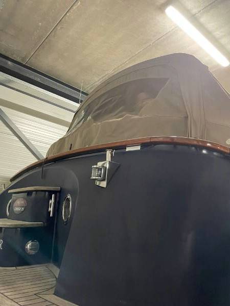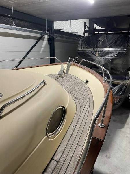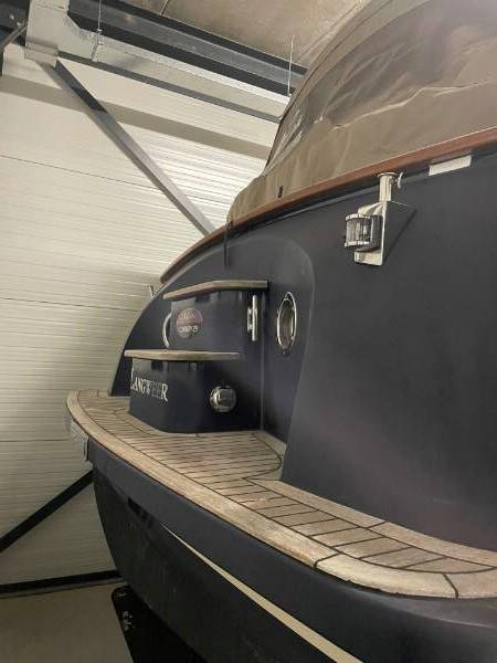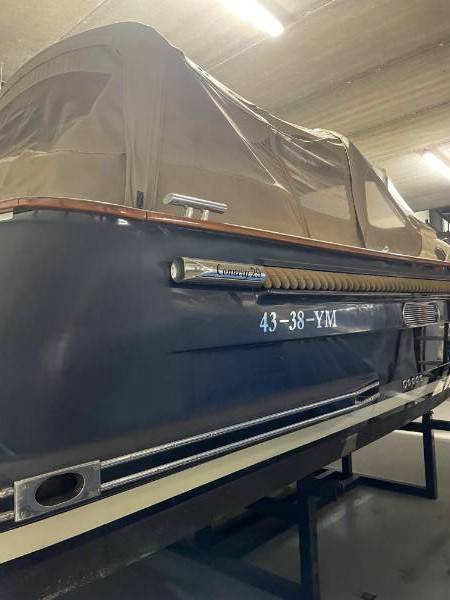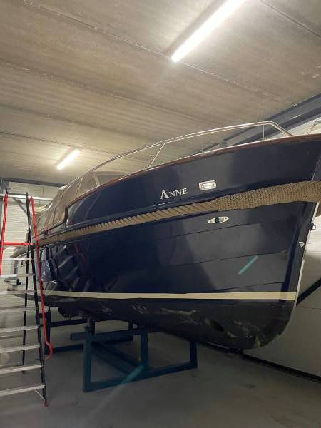 De motorsloep ligt in de winteropslag van Aquatec Industires te 8551 RK Woudsend, Zwaan 28.