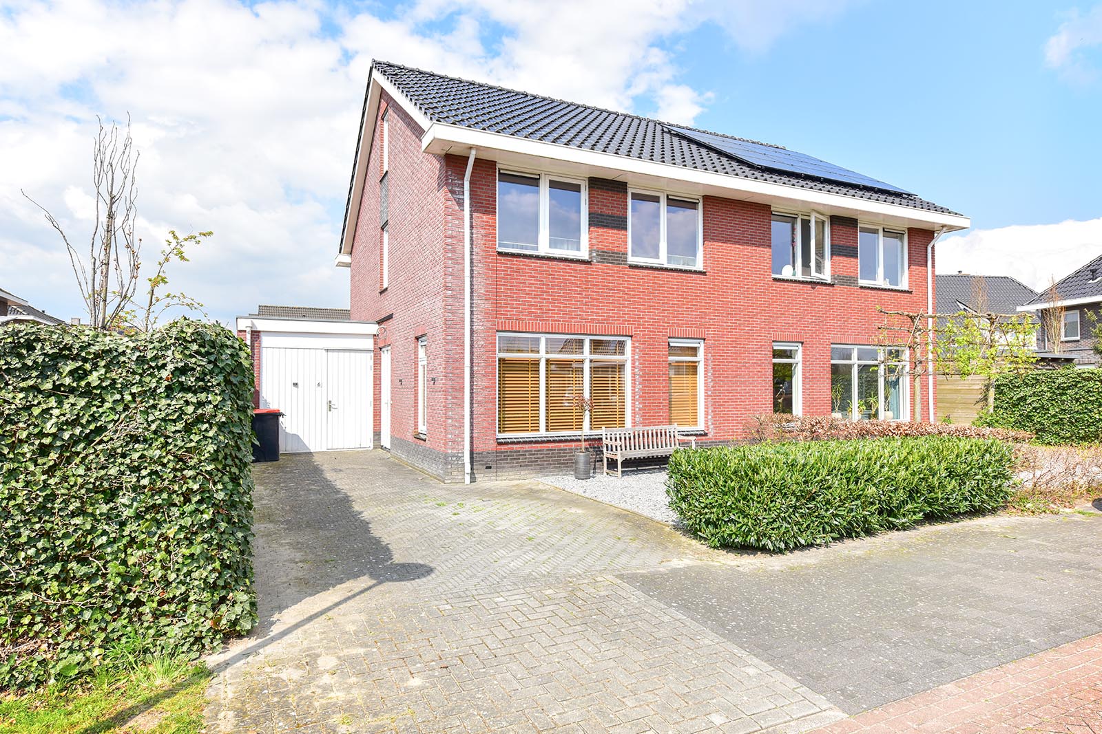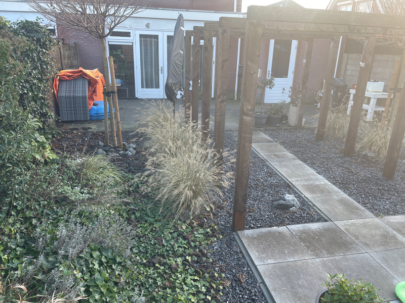 Extern: standaard aangelegde tuin (voortuin/achtertuin). De hoofdtuin is gelegen op het noordwesten. Aangebouwde stenen garage.